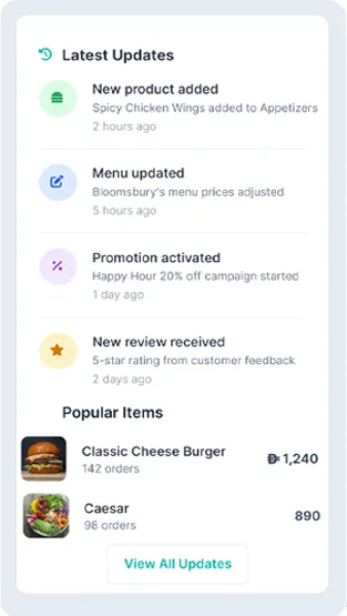 Your menu is configured during onboarding and can be updated as needed. You’ll have the flexibility to modify items, pricing, promotions and availability to keep your menu up to date.