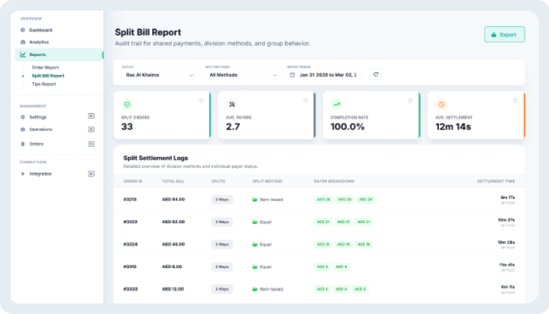 Gain complete visibility into your restaurant’s performance with real-time reporting and analytics. Track orders, monitor revenue trends, view split bill activity, and understand tipping patterns through clear, easy-to-use dashboards designed to help you make faster, smarter operational decisions.